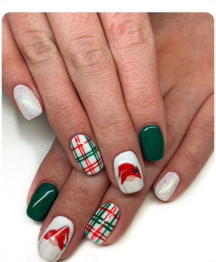 This merry Christmas mix features white nails adorned with red and green plaid, jolly gnome art, and glossy green accents — a perfect nod to Santa’s festive spirit.