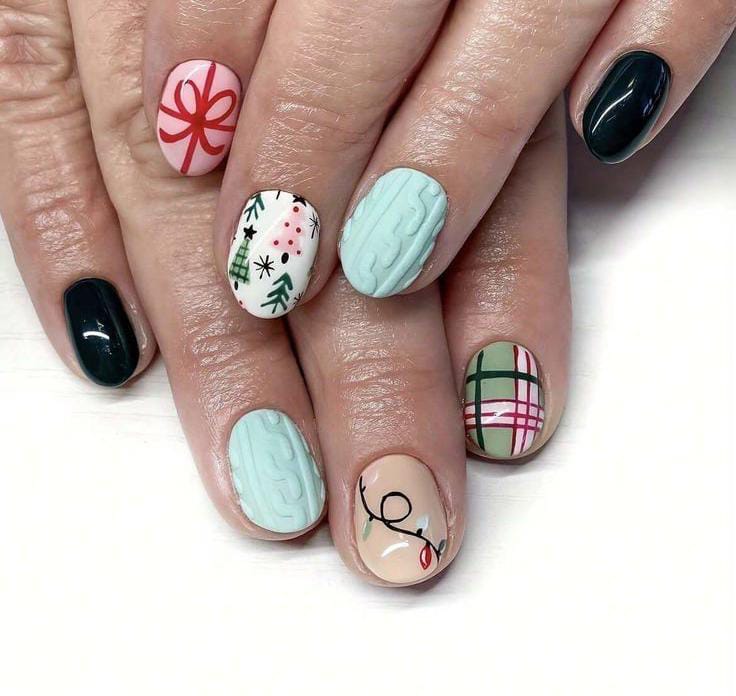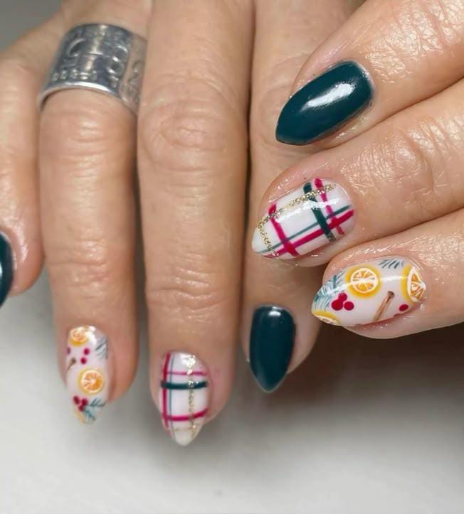 Soft white plaid nails with hints of red and green meet deep teal and citrus-inspired designs, giving a fresh, cozy look that feels like a cup of mulled wine on a snowy Christmas evening.