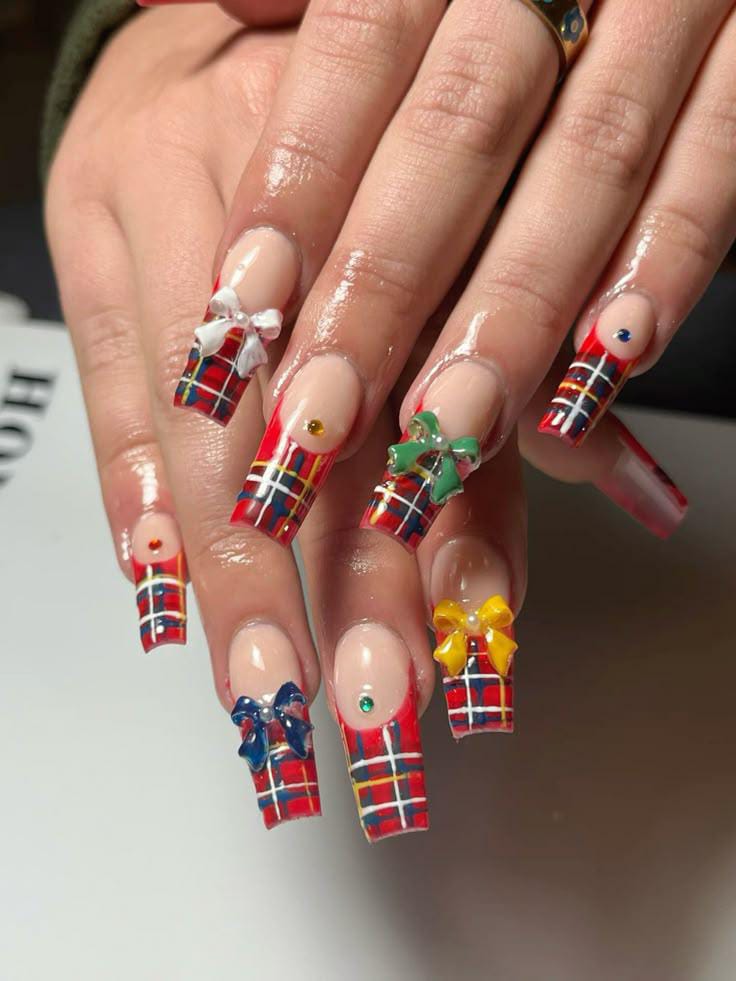 These long square nails mimic wrapped Christmas presents with bold red plaid patterns, topped with colorful 3D bows and tiny gems for a fun, gift-like holiday look.