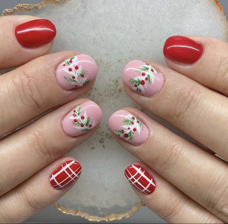 Short rounded nails with a delicate pink base accented by holly leaf designs and red plaid tips, offering a sweet, cozy, and feminine Christmas holiday touch.