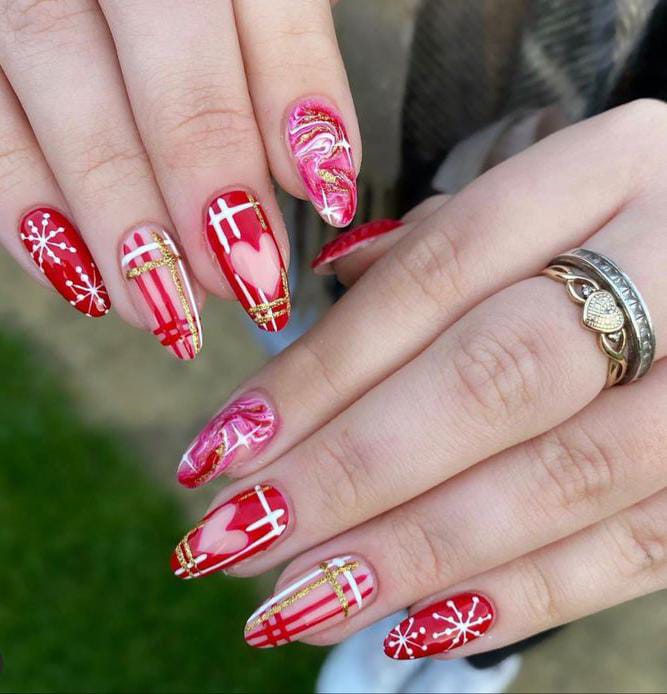 Red and pink plaid nails paired with gold ribbon accents, heart shapes, and snowflake art, giving off a chic, romantic, and festive Christmas holiday sparkle.
