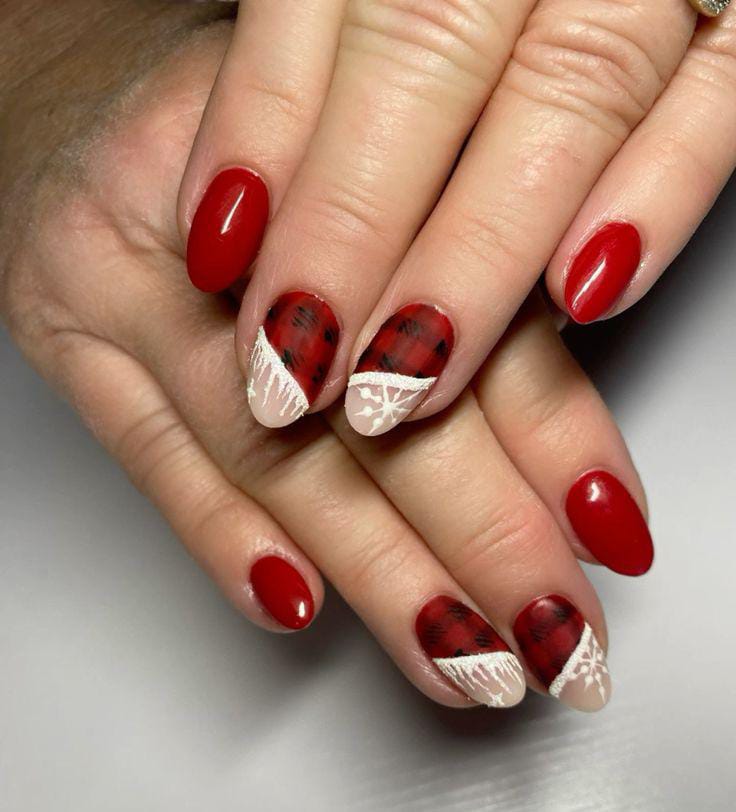 Red plaid meets delicate white lace detailing for a chic, festive manicure that balances rustic warmth with a touch of sophisticated Christmas.
