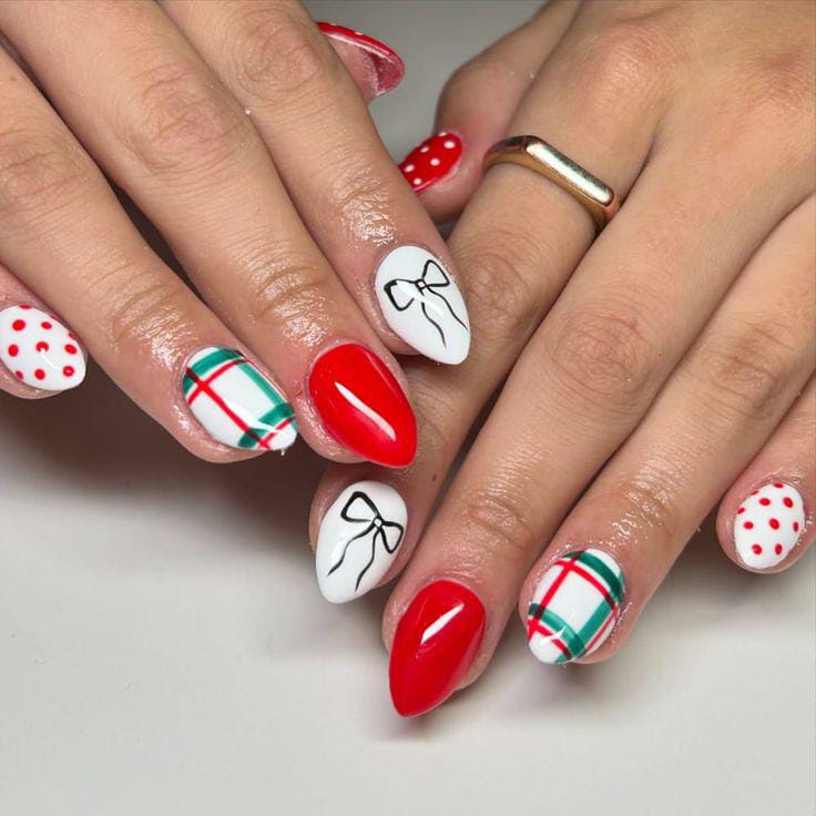Cute and feminine, this look pairs bold red and white polish with plaid patterns, dainty black bow designs, and cheerful polka dots for a gift-wrapped Christmas feel.