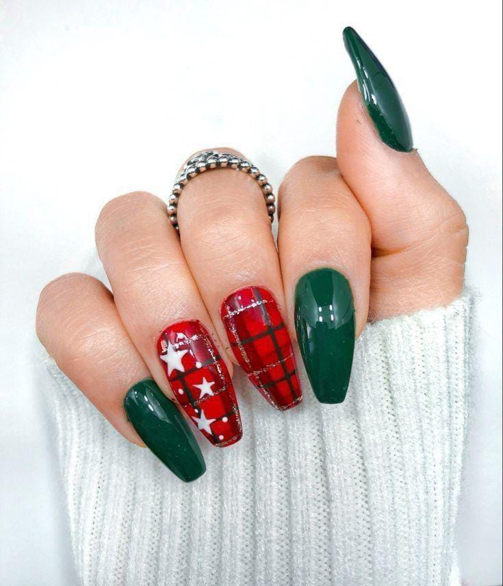 Deep green and red plaid nails with star accents give this look a bold, festive sparkle—ideal for anyone who loves a classic Christmas holiday color palette with a glam finish.