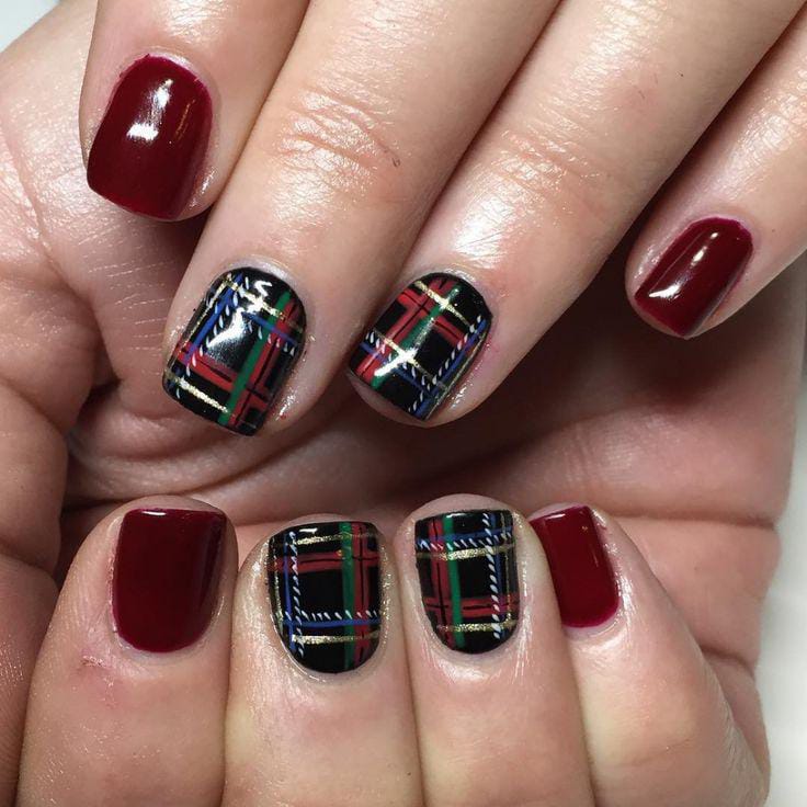 Deep red and black nails paired with crisp plaid designs in festive red, green, and gold lines create a timeless Christmas look.