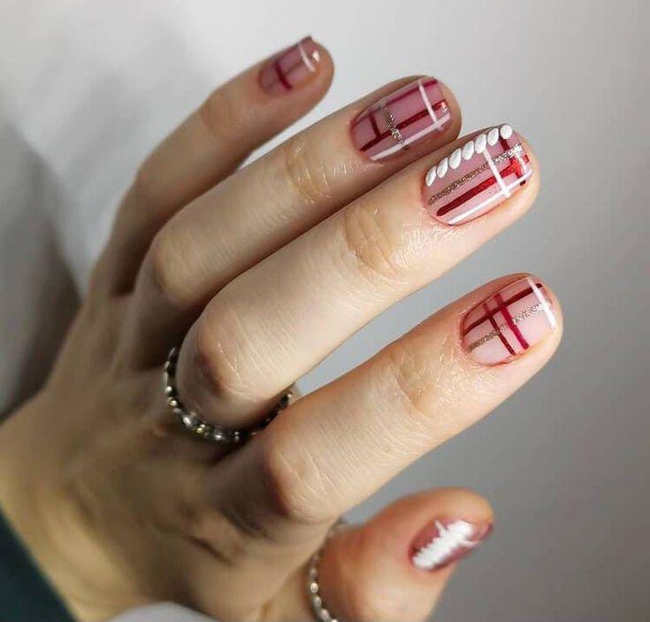 Soft nude bases with fine red and white plaid lines and subtle gold accents create a minimal yet festive style with a cozy Christmas touch.