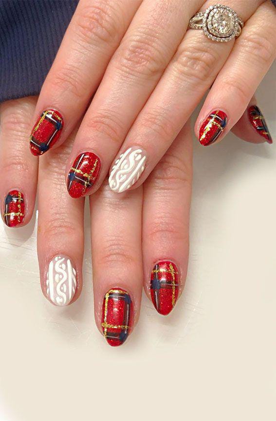 This design mixes deep red shimmer nails with rich navy and gold plaid lines, paired with creamy white accent nails featuring cozy cable-knit-style patterns for a Christmas festive, sweater-inspired look.