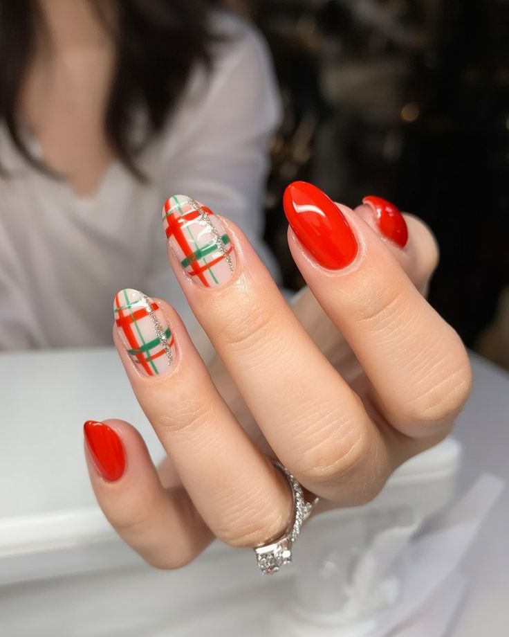 Bright red nails meet soft nude bases accented with cheerful red, green, and silver plaid lines — a crisp and modern take on traditional Christmas holiday tartan.