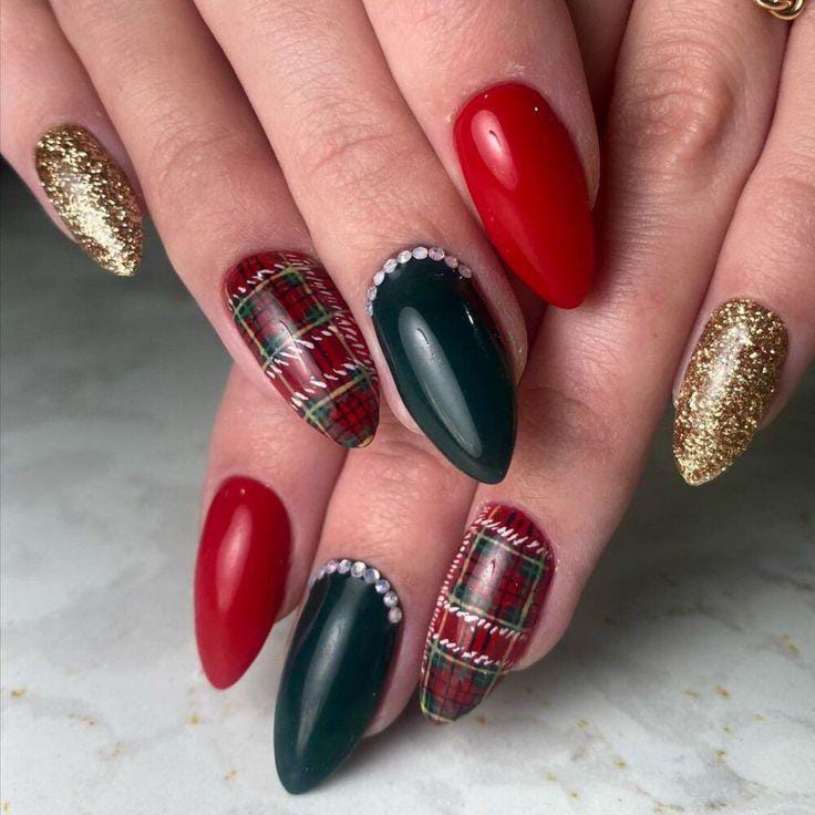 A bold blend of glossy red, dark green, and gold glitter nails, with tartan accents and tiny rhinestones, giving the perfect mix of cozy plaid charm and Christmas holiday sparkle.