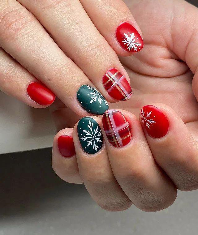 Red and green matte nails combine with red plaid patterns and delicate white snowflakes, capturing a playful yet elegant Christmas spirit.