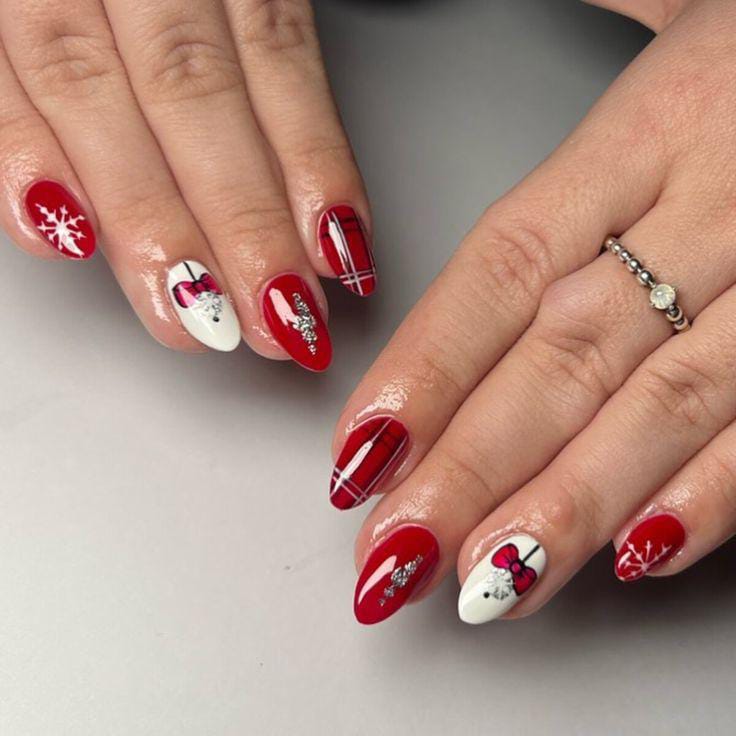 This chic mix features glossy red and white nails decorated with plaid prints, silver sparkle, and adorable ribbon bow accents — just like beautifully wrapped Christmas holiday presents.