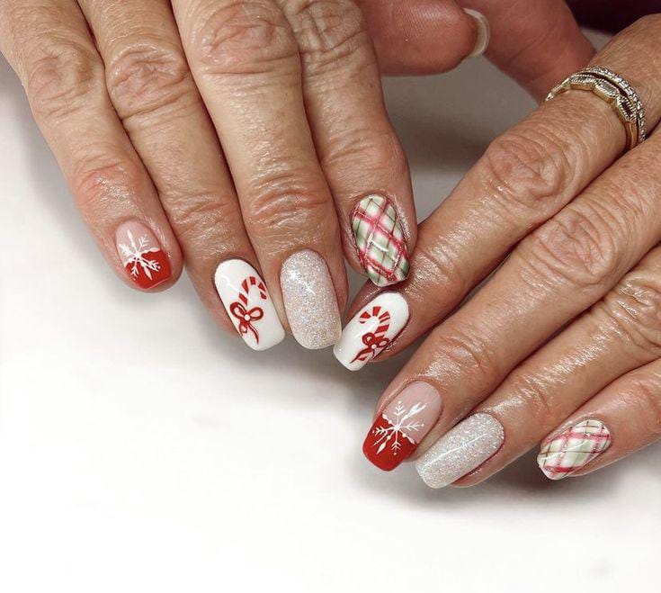 A festive mix of red, white, and shimmer with candy cane art, snowflakes, and plaid accents gives this look a joyful, cozy Christmas feel.