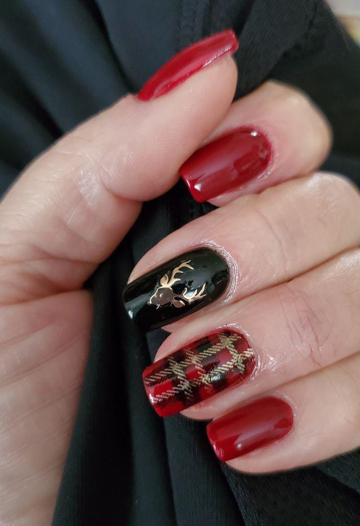 Deep red and black nails with a golden reindeer silhouette and classic plaid print create a bold, elegant Christmas holiday statement.