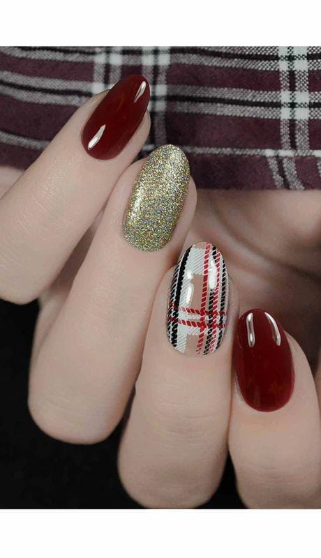 Rich burgundy nails paired with gold glitter and a clean tartan plaid make this design chic yet festive, perfect for a classy Christmas look.