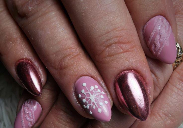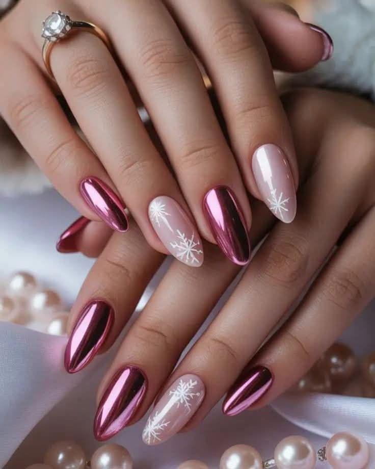 A mix of rosy pink chrome and soft nude nails with fine white snowflakes creates a chic, feminine winter look that balances shine with softness.