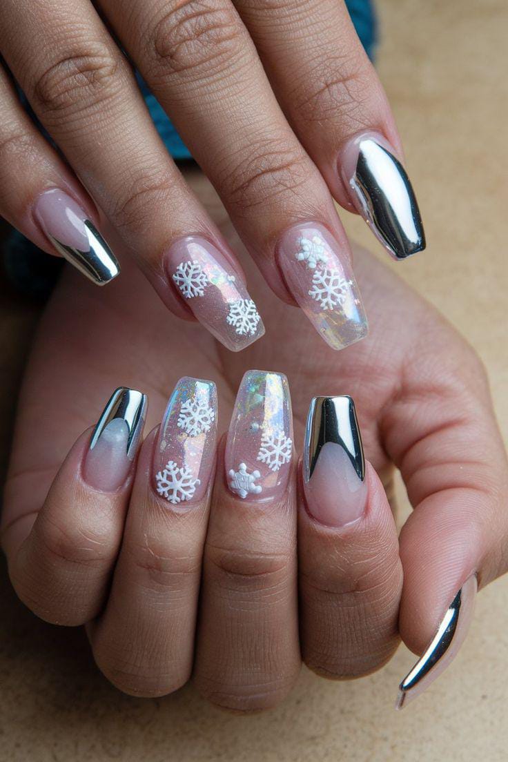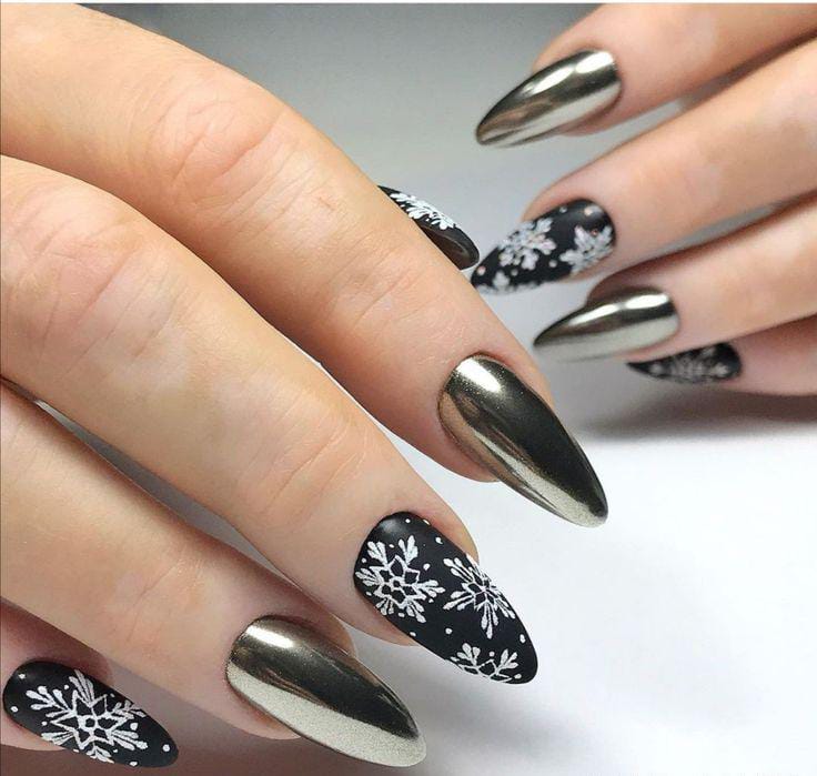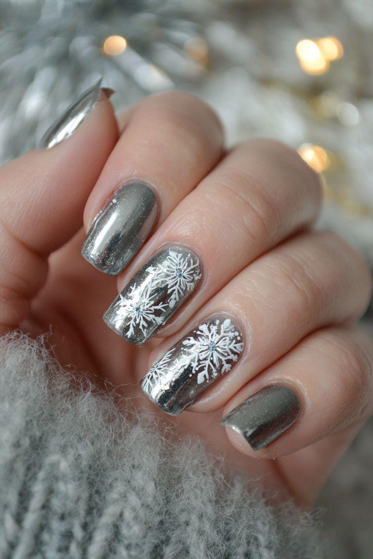This design contrasts sleek platinum chrome with matte black nails decorated in crisp white snowflakes. The mix of metallic shine and wintry patterns gives it a modern, high-contrast winter look.