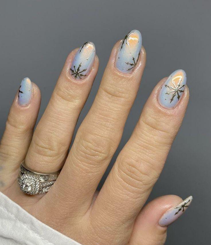 These nails feature a dreamy iridescent chrome base topped with delicate white snowflakes, creating a soft, glowing winter wonderland look.