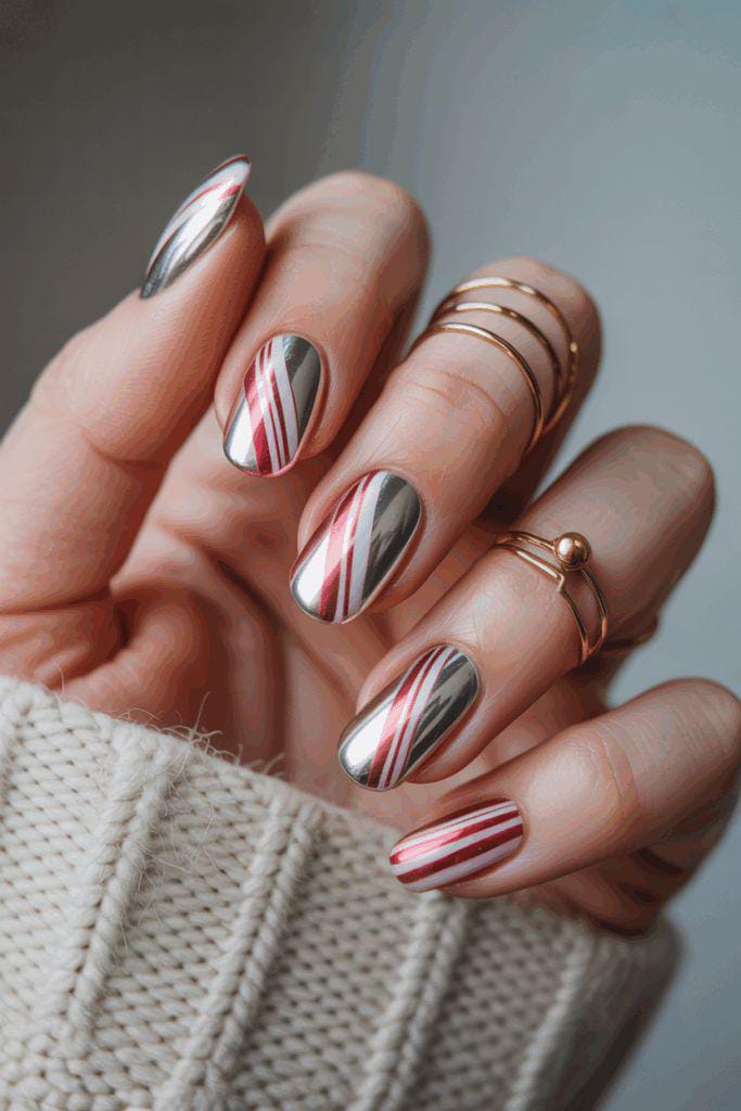 Sleek silver chrome nails decorated with crisp red and white diagonal stripes give a festive, candy-cane look with a modern metallic winter twist.