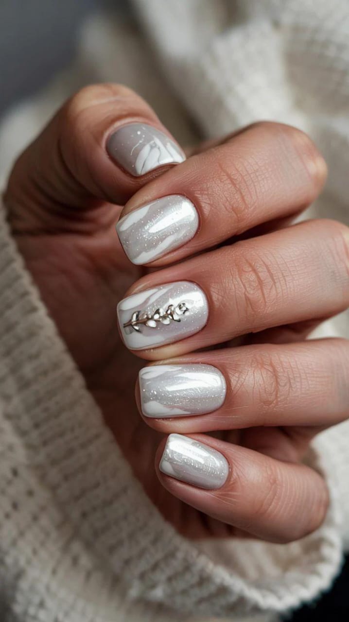 Icy pearl-white chrome nails feature soft marbled swirls and a subtle metallic shimmer, finished with a small silver leafy embellishment for a clean, elegant winter style.