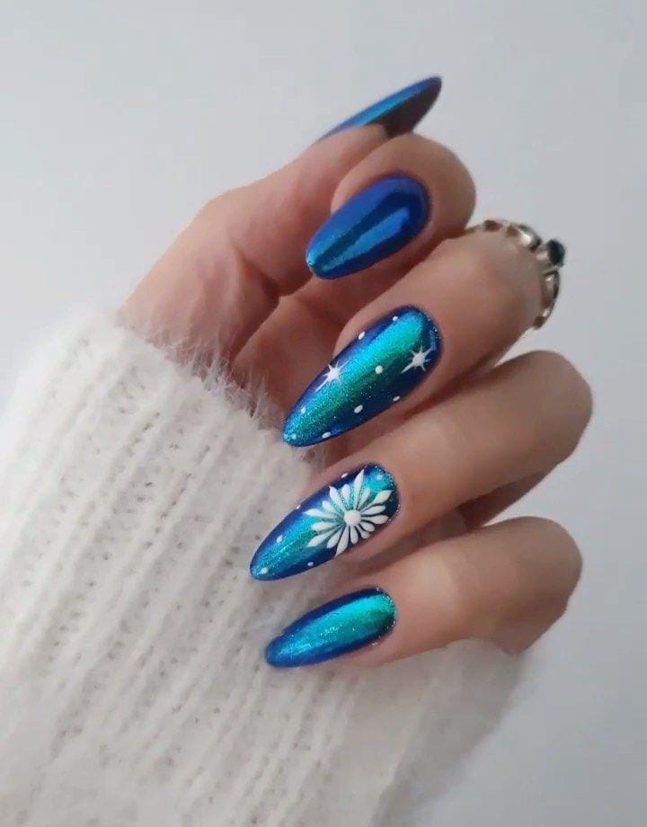 A vibrant blue-green chrome gradient mimics the colors of the northern lights, enhanced with small stars and a white floral accent for a magical, celestial winter feel.