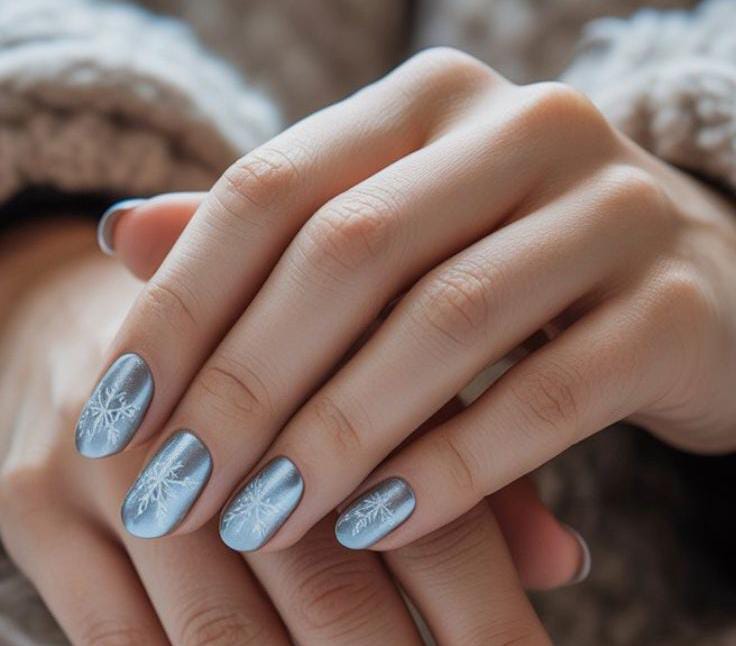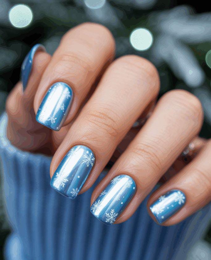 Light blue mirror-chrome nails featuring delicate white snowflakes, offering a crisp and clean frosty-winter feel.
