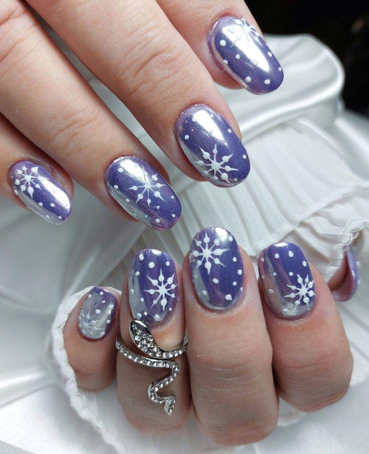 A soft, purple chrome base is decorated with white snowflakes and tiny dots, creating a dreamy winter-snowfall effect. The look feels festive, delicate, and perfect for cold-weather themes.