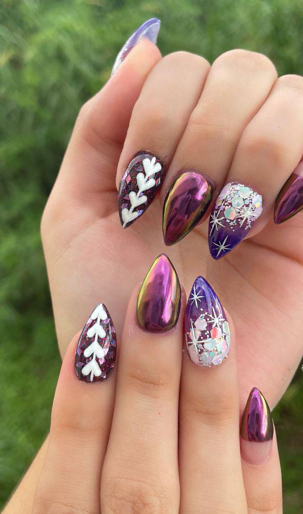 This set blends deep purple-chrome nails with white leafy accents and chunky iridescent glitter for a playful winter-party style.