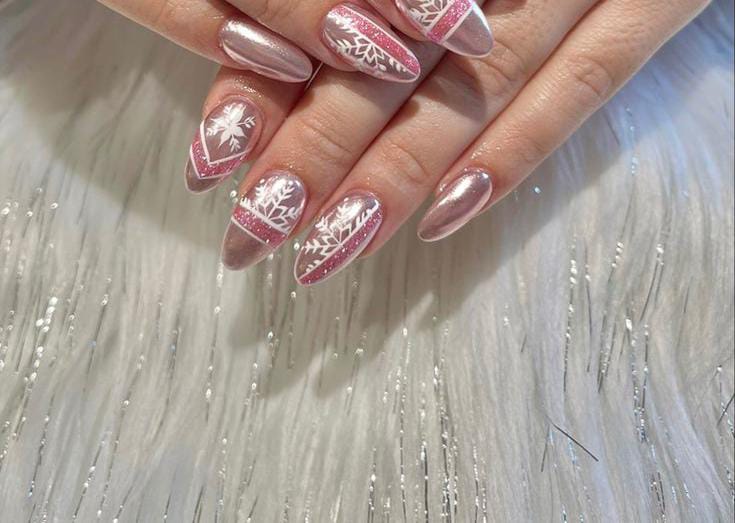 Soft rose-pink chrome nails are paired with detailed white snowflake patterns and subtle glitter striping, giving the design a cozy yet elegant winter feel. It’s refined, feminine, and perfectly seasonal.