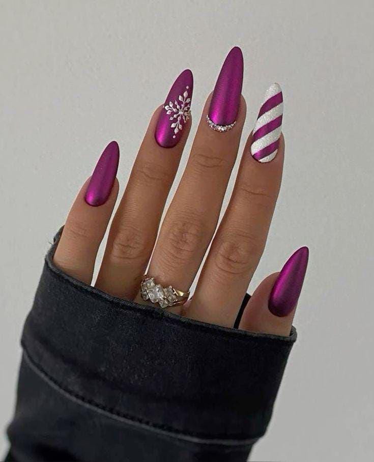 A rich matte plum chrome base is elevated with a jeweled snowflake and a candy-stripe silver accent nail. The look mixes festive charm with a modern, glam winter aesthetic.