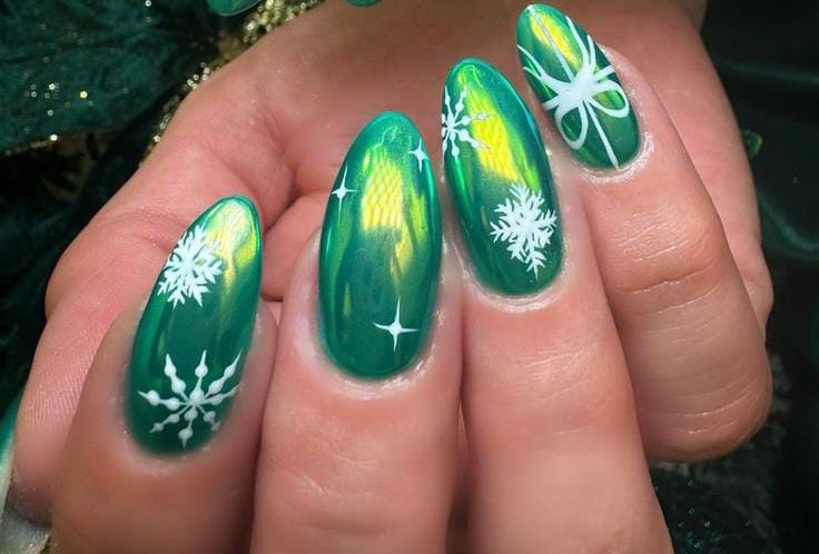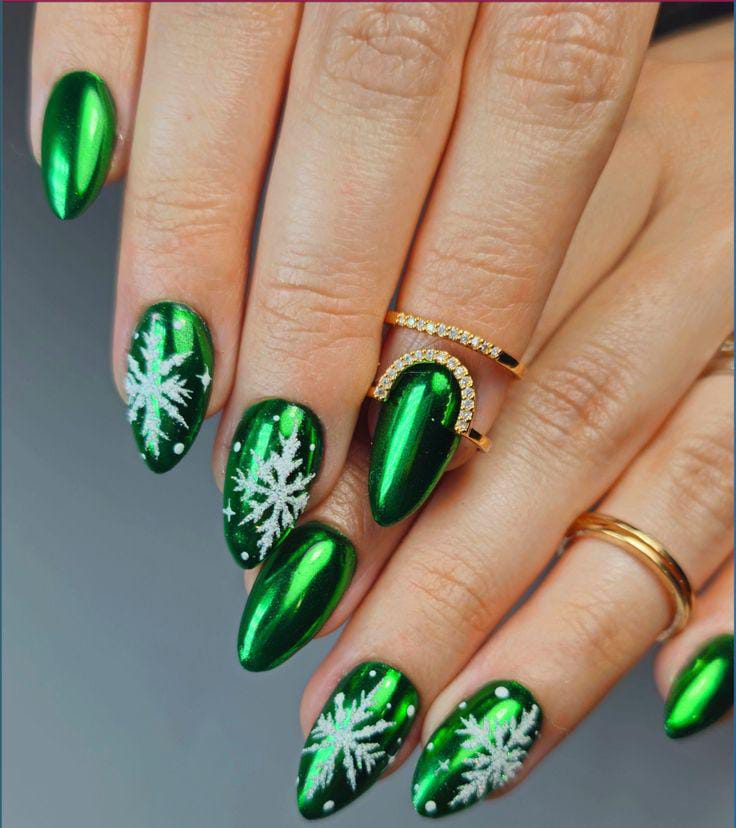 This design features rich emerald-green chrome nails topped with delicate white snowflakes, giving the whole look a bold yet festive winter glow.