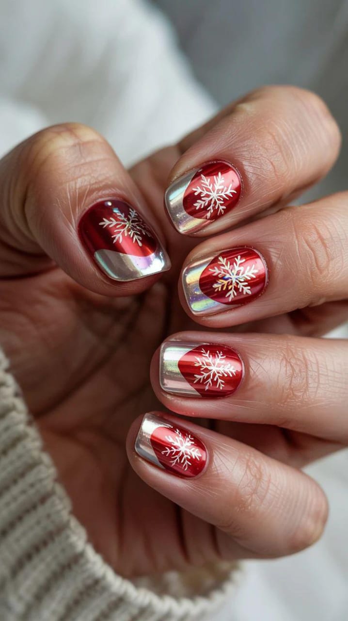 A vibrant red chrome base is paired with soft silver chrome accents and crisp white snowflakes, creating a cozy winter holiday feel with a modern twist.