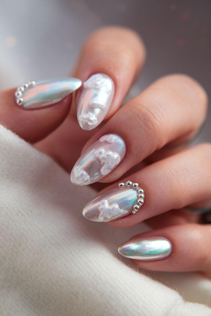 A soft, iridescent chrome base paired with raised pearly cloud accents and tiny silver beads, giving the nails a dreamy, winter-fairy aesthetic.