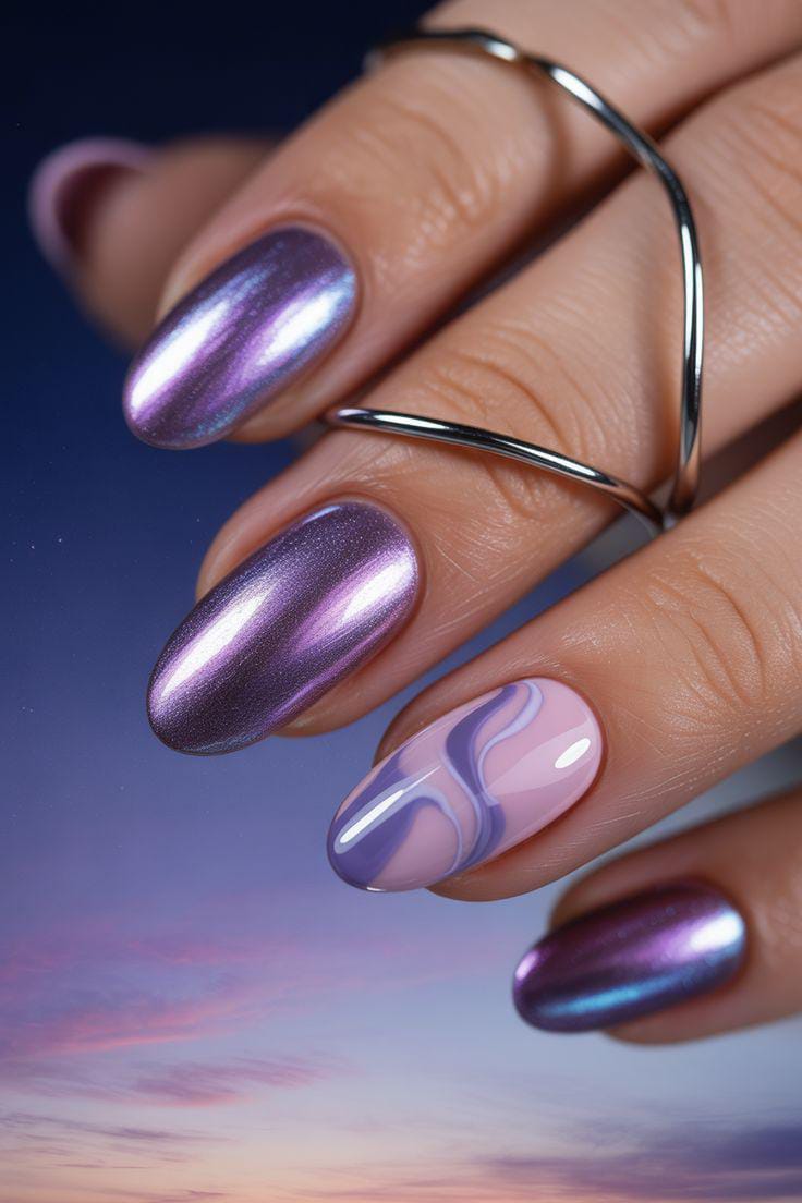 Reflective purple-blue chrome nails mixed with one soft pastel swirl accent, capturing the vibe of shifting winter skies and glowing auroras.