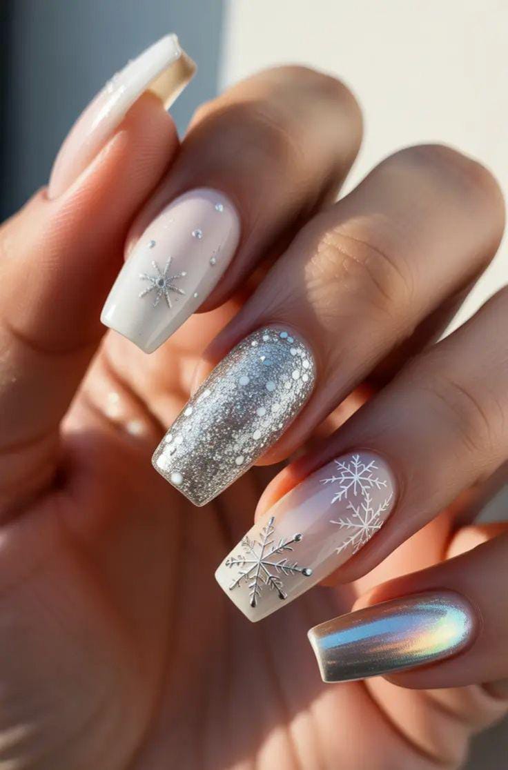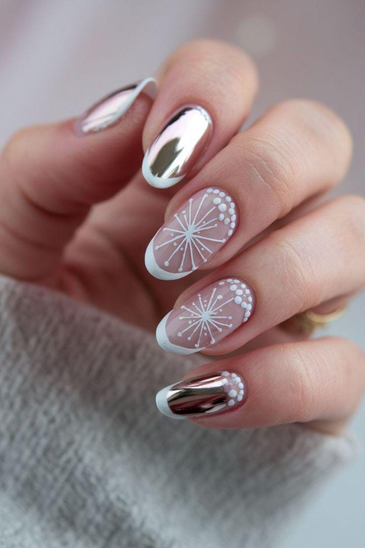 Chrome-silver accents mix with snowy white dotted starburst patterns and soft French tips for a clean, whimsical winter aesthetic.