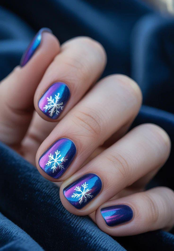 Short chrome nails that shift between blue, purple, and pink tones, topped with fine white snowflakes for a soft Northern Lights winter look.