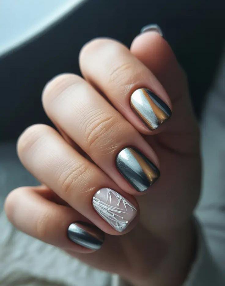 These nails combine cool silver chrome with one soft nude accent nail decorated with fine white linework, giving a clean and modern winter vibe. It’s subtle, chic, and effortlessly polished.