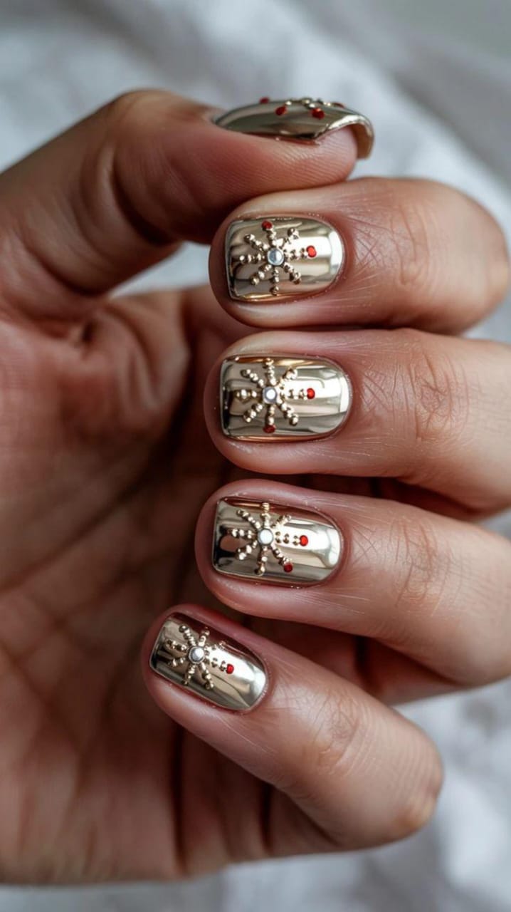 This design features rich gold chrome nails accented with raised snowflake-style studs and tiny red gems, giving the whole look a festive, high-end winter holiday vibe.