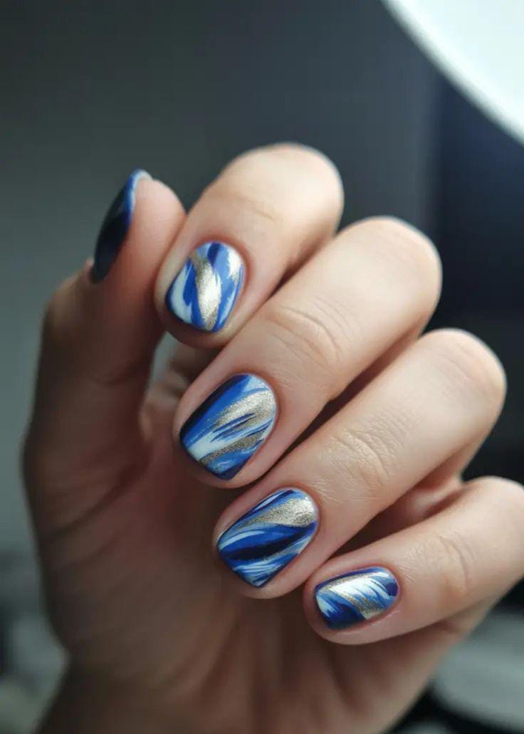 Metallic blue and silver chrome swirls blend together in soft, painterly strokes, creating a cool, wintry pattern that feels modern and artistic.