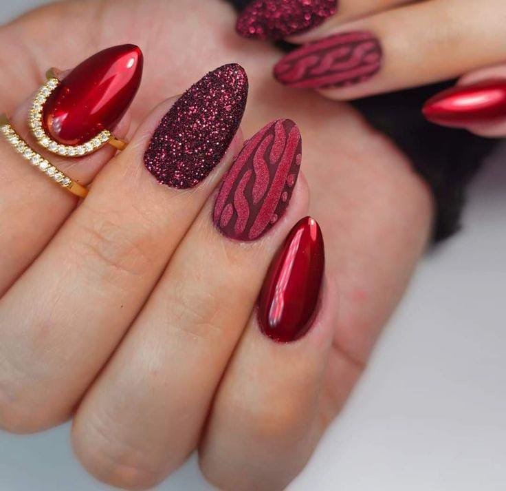 Deep red chrome nails are paired with glittery accents and sweater-textured matte patterns in matching tones. The mix of shine, sparkle, and cozy detailing gives it a rich, winter festive, and luxurious vibe.