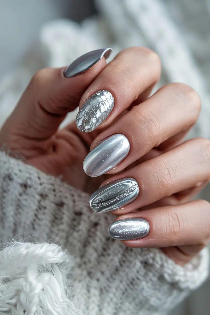 Cool silver chrome blends with textured glitter accents and subtle pattern work, making the nails look sleek, modern, and perfectly winter-themed.