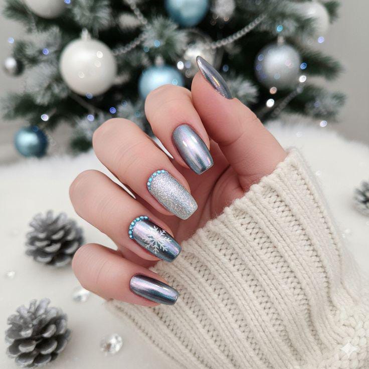Soft, iridescent chrome nails mix with a glittery accent nail and delicate snowflake detailing, enhanced by tiny blue gems for a winter festive, icy finish.