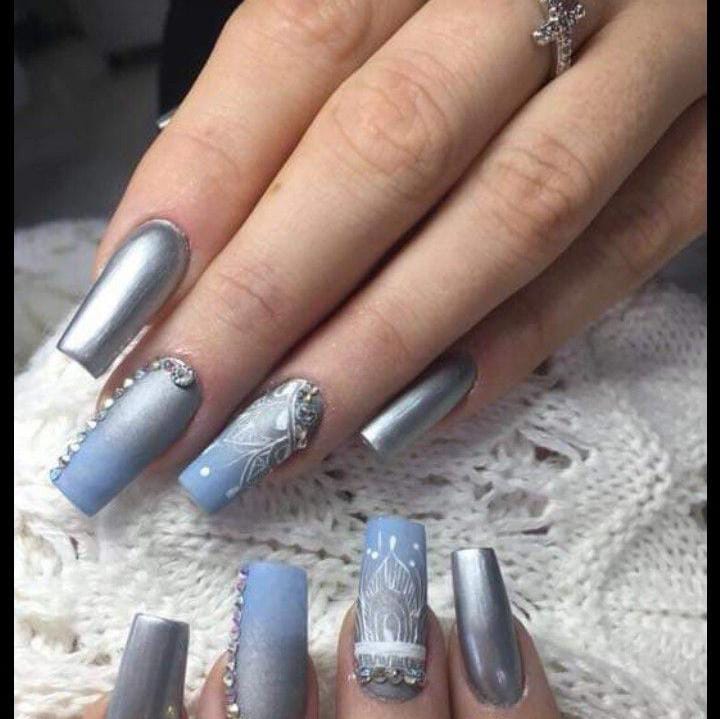 Long silver-blue ombré nails are paired with metallic chrome and delicate white lace-style detailing, finished with small crystals for a glamorous winter-luxury effect.