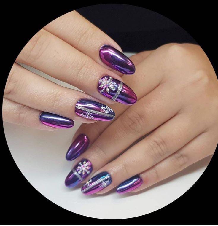 This design features deep purple and blue chrome nails with a glossy, mirror-like shine, accented by silver snowflakes and metallic striping. The overall look feels bold, futuristic, and wintery.