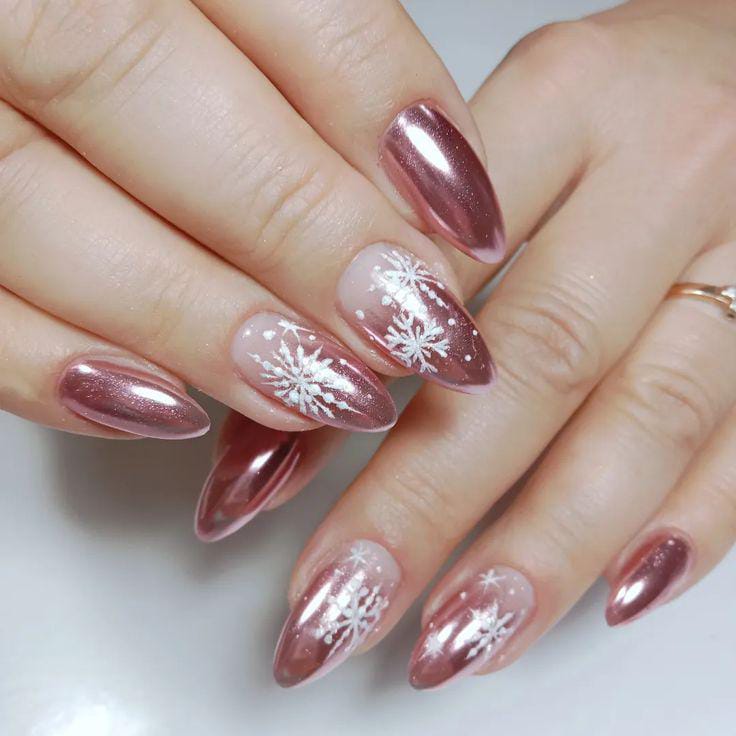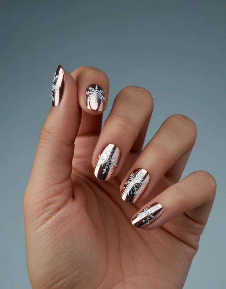 Shiny rose-gold chrome nails are topped with soft white snowflake accents, creating a festive and elegant winter look.