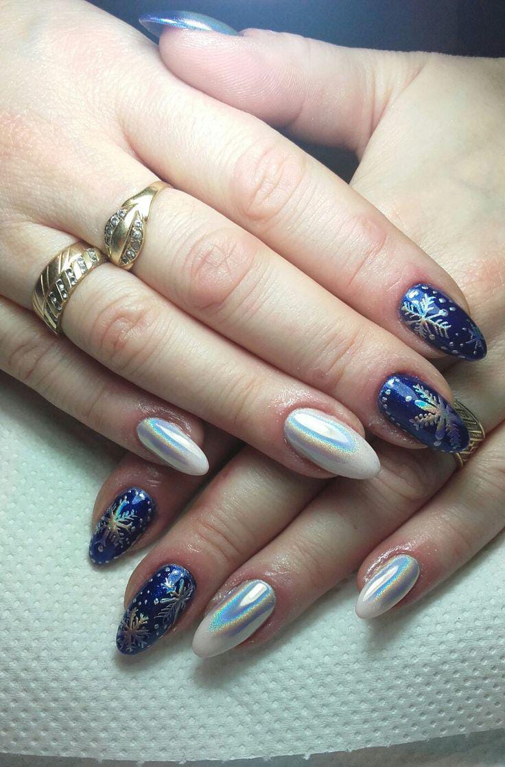 Rich navy nails with golden snowflakes mix with icy silver-chrome accents to create a striking contrast. It gives off a magical, starry-night winter vibe.