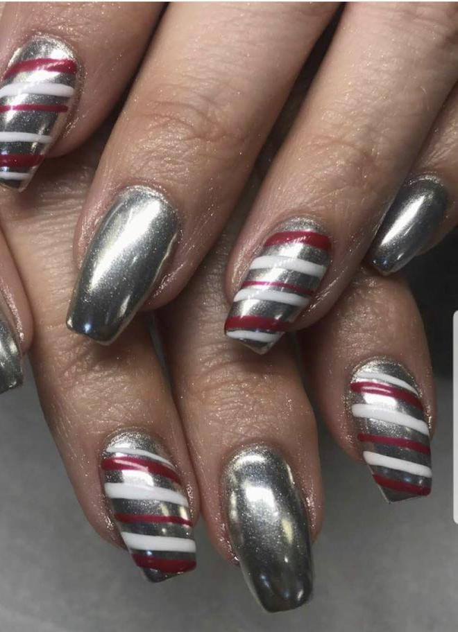 Silver chrome nails are paired with bold red and white striped accents, giving the set a fun candy-cane effect. The look is winter festive, modern, and eye-catching.