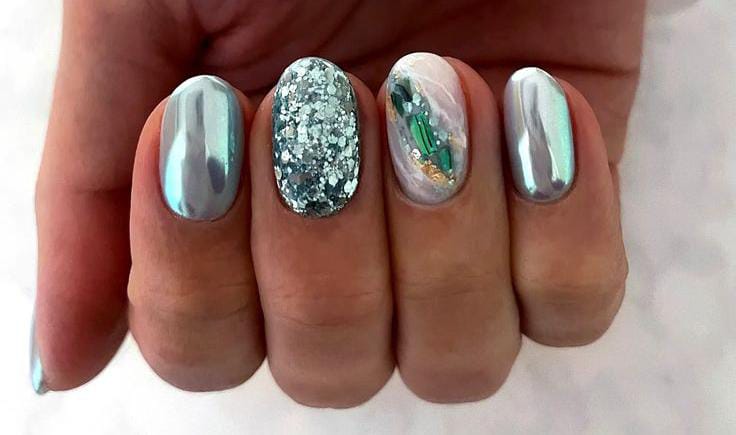 With icy silver chrome, chunky glitter, and gemstone-style marbling, this design has a bold, frosty look inspired by frozen winter landscapes.