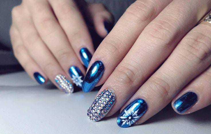 Vibrant blue chrome nails are mixed with rhinestone-covered accents and delicate white snowflakes. The style is glamorous, sparkling, and perfect for a bold winter statement.