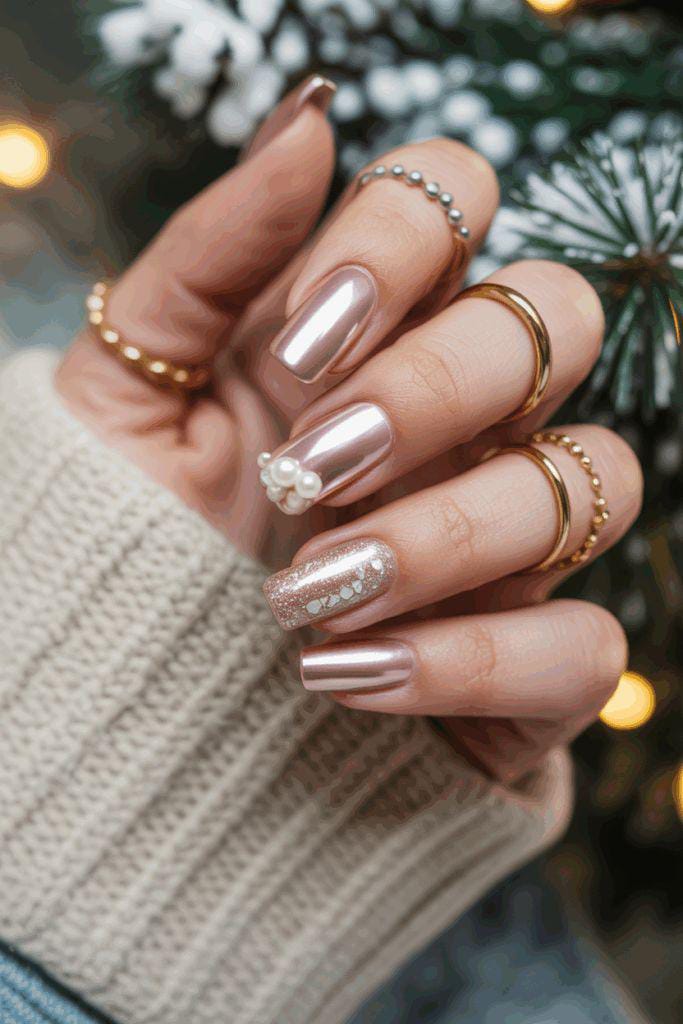 These sleek light-chrome nails mix metallic shine with soft glitter and tiny pearl accents, creating a chic winter look. The blend of shimmer and minimal details makes the style feel cozy yet luxurious.