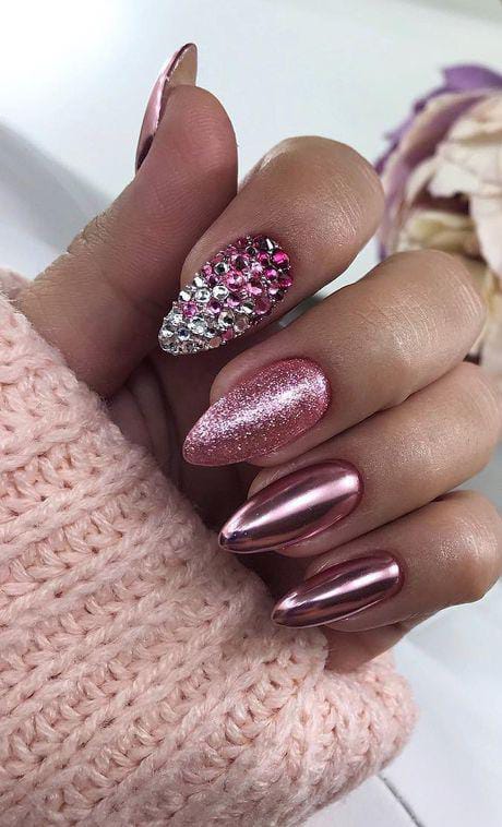 A bold mix of pink chrome, glitter, and crystal-covered accents gives this set a glamorous, winter festive vibe. The combination of textures makes the design eye-catching and perfect for holiday sparkle.